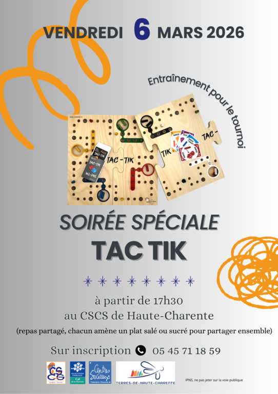 Entraînement au tournoi Tac Tik : 6 mars, à partir de 17h30 au CSCS (repas partagé, chacun amène un plat salé ou sucré)