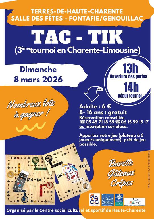 Tournoi Tac Tik : dimanche 8 mars à partir de13h, salle des fêtes de Fontafie/Genouillac (sur inscription)