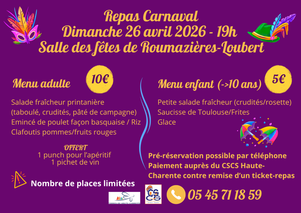 Repas carnaval : 26 avril 2026 - 19h - salle des fêtes de Roumazières-Loubert